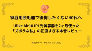 「家庭用は痛い?効果ない?」そんな不安を抱える40代の私が、Ulike Air10を2ヶ月ガチ検証。ズボラでも挫折しなかった理由や、気になる痛み、肌の変化まで忖度なしにレビューします。メリットだけでなく、実際に使ってわかったデメリットも正直に公開。後悔したくない方のための最終チェック記事です。